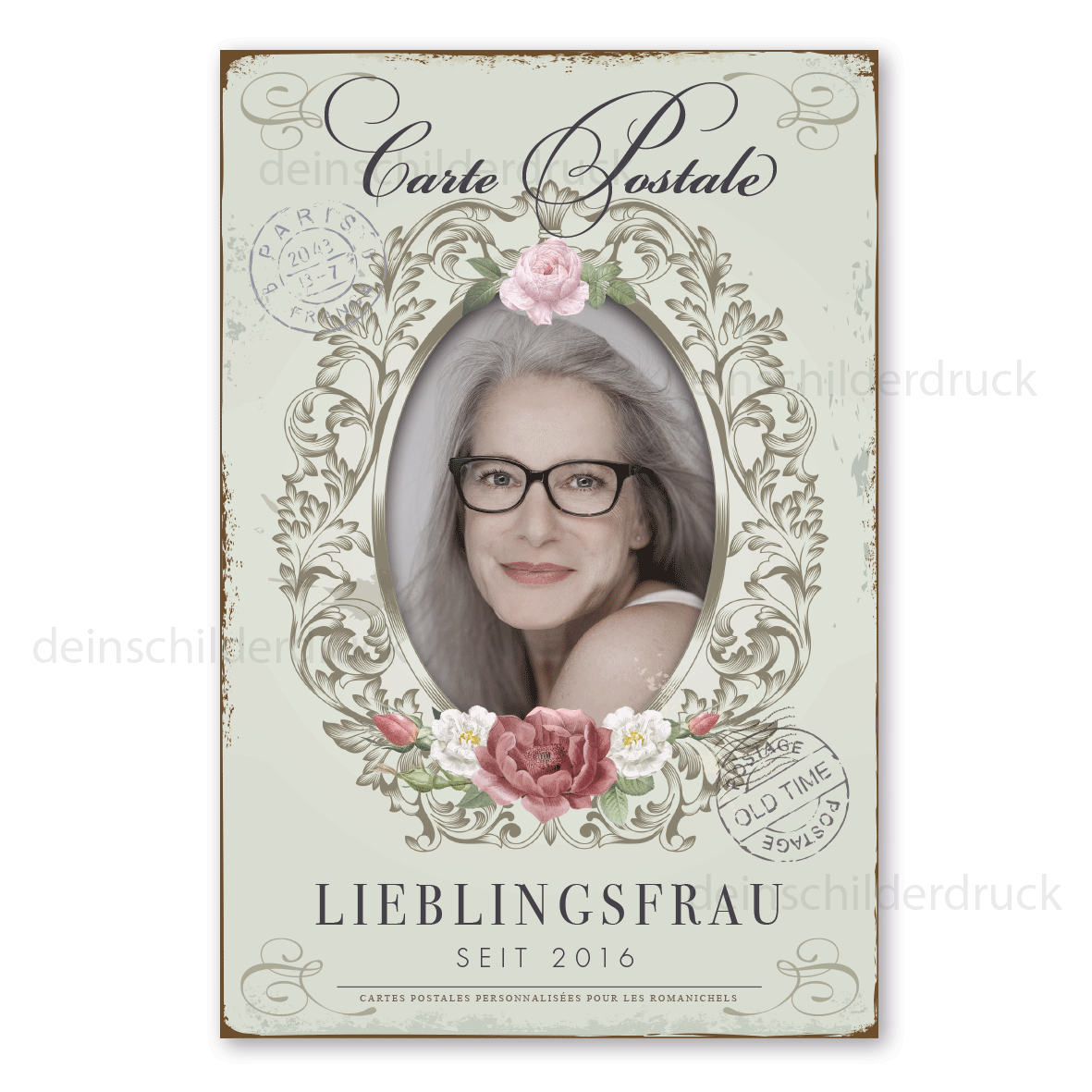 Schild im Stil einer nostalgischen Postkarte - Carte Postale - Fleurs Paris mit Ihrem Foto - auch mit Ihrem Wunschtext - Hochformat