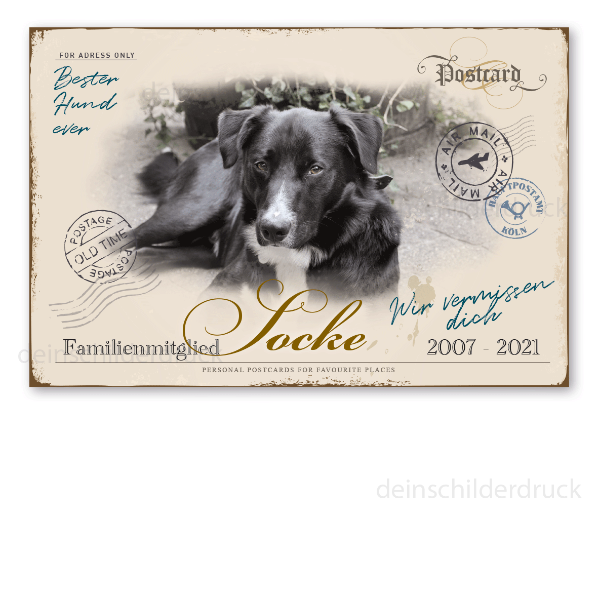 • Dieses originelle Postkartenschild kann nur mit individuellen Attributen bestellt werden. Laden Sie Ihr Bild über den Konfigurator auf dieser Seite auf unseren Server. Stellen Sie zuvor unbedingt sicher, dass Ihr Wunschbild hoch aufgelöst ist bzw. in den Abmessungen mindestens der gewünschten Schildergröße entspricht. Ein Foto, das mit einem aktuellen Smartphone aufgenommen wurde, ist in der Regel gut geeignet. Ändern Sie nichts an den Farben, dies wird von uns erledigt.