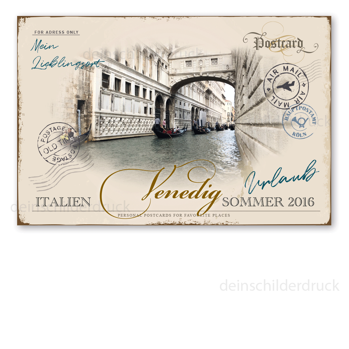 Retroschilder im Stil alter Postkarten erfreuen sich mit ihrem nostalgischen Aussehen großer Beliebheit. Unsere Postkartenschilder / Postcard Signs sind für Ihre Bilder konzipiert, die Sie uns bequem im Rahmen der Bestellung über die Upload-Funktion zukommen lassen können. Ihre Bilder werden an den jeweiligen Look des Postkartenschildes angepasst und zusammen mit Ihrem Wunschtext eingefügt (siehe Artikelbilder als Beispiel). Die Produktion erfolgt nach Ihrer Druckfreigabe im hochwertigen Digitaldruck mit anschließender UV/Antigraffiti-Schutzlackierung. Unsere Postkartenschilder im Retroausführung sind in diversen Ausführungen erhältlich. Die Patina (Kratzer und Beschädigungen) ist nicht echt, sondern nur aufgedruckt, dennoch wirken diese Schilder alt, so als wären sie vor Jahrzehnten produziert worden. Wie unsere ansprechenden Retro- und Vintage-Schilder werden auch die Postkartenschilder aus 2 mm Hartaluminium gefertigt, sie sind daher außerordentlich stabil und langlebig. Verschenken Sie dieses dekorative Schild mit Ihrem Photo, bei Bedarf auch mit Ihrem Wunschnamen oder -widmung, zum Geburtstag, zur Hochzeit oder behalten Sie es einfach selbst.