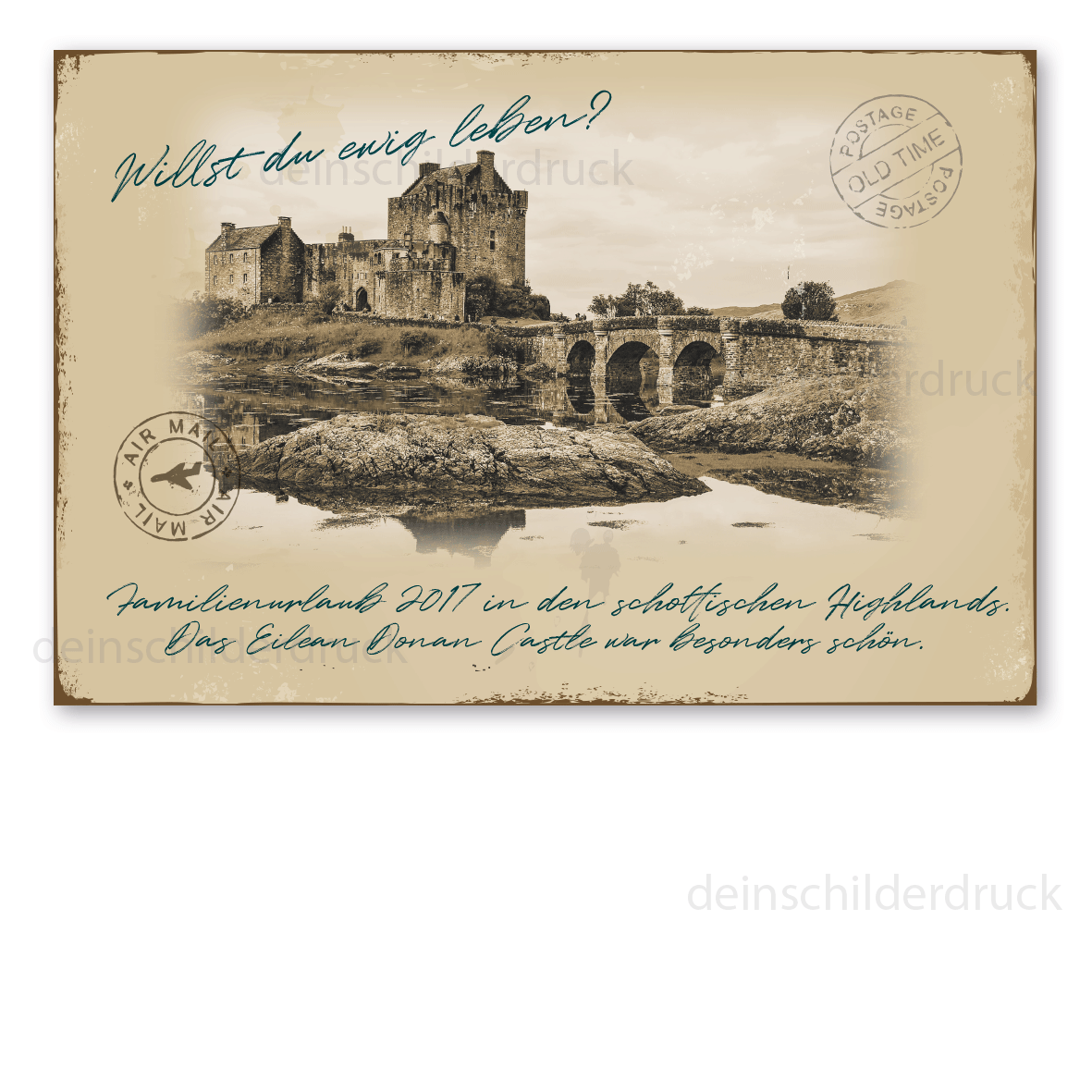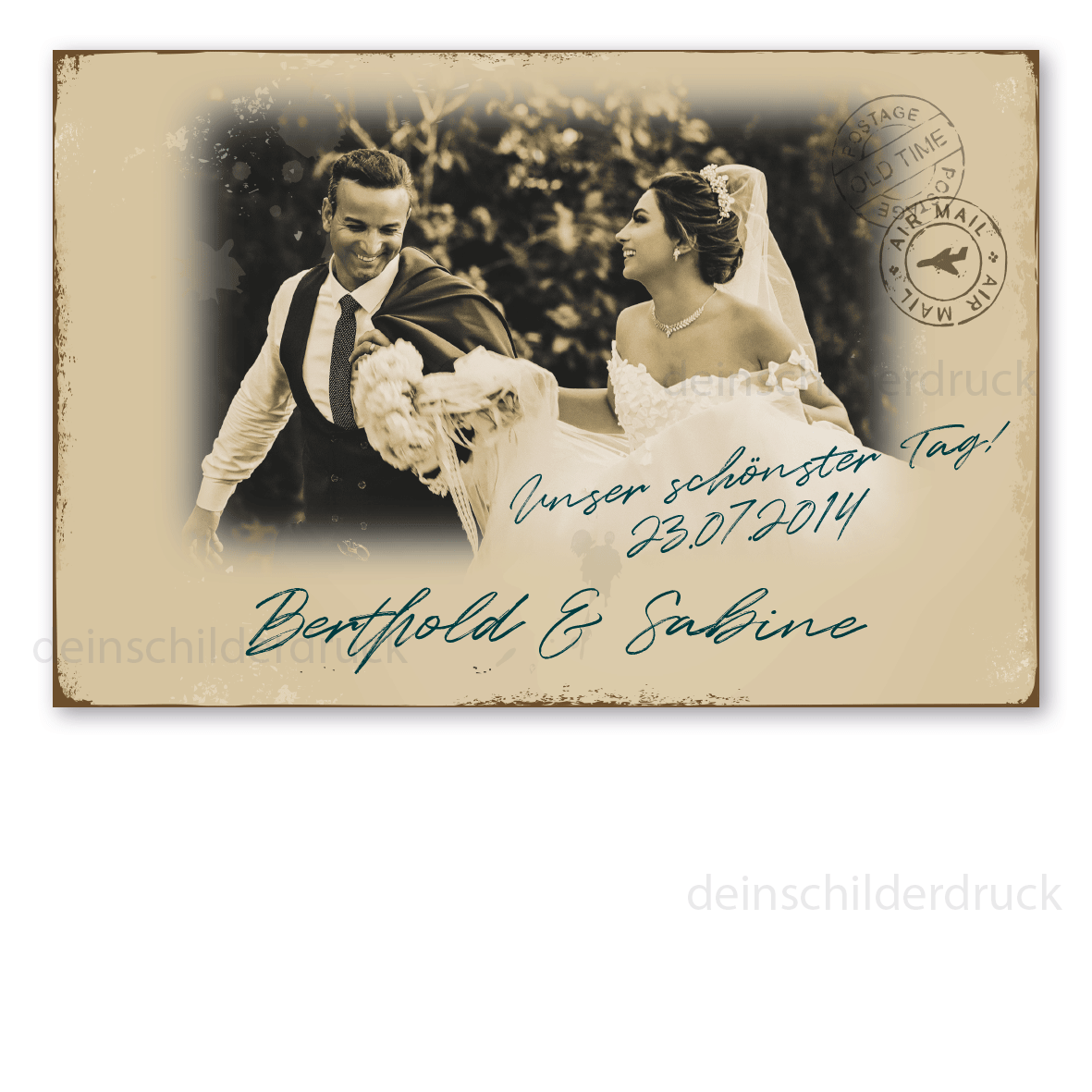 Retroschilder im Stil alter Postkarten erfreuen sich mit ihrem nostalgischen Aussehen großer Beliebheit. Unsere Postkartenschilder / Postcard Signs sind für Ihre Bilder konzipiert, die Sie uns bequem im Rahmen der Bestellung über die Upload-Funktion zukommen lassen können. Ihre Bilder werden an den jeweiligen Look des Postkartenschildes angepasst und zusammen mit Ihrem Wunschtext eingefügt (siehe Artikelbilder als Beispiel). Die Produktion erfolgt nach Ihrer Druckfreigabe im hochwertigen Digitaldruck mit anschließender UV/Antigraffiti-Schutzlackierung. Unsere Postkartenschilder im Retroausführung sind in diversen Ausführungen erhältlich. Die Patina (Kratzer und Beschädigungen) ist nicht echt, sondern nur aufgedruckt, dennoch wirken diese Schilder alt, so als wären sie vor Jahrzehnten produziert worden. Wie unsere ansprechenden Retro- und Vintage-Schilder werden auch die Postkartenschilder aus 2 mm Hartaluminium gefertigt, sie sind daher außerordentlich stabil und langlebig. Verschenken Sie dieses dekorative Schild mit Ihrem Photo, bei Bedarf auch mit Ihrem Wunschnamen oder -widmung, zum Geburtstag, zur Hochzeit oder behalten Sie es einfach selbst.