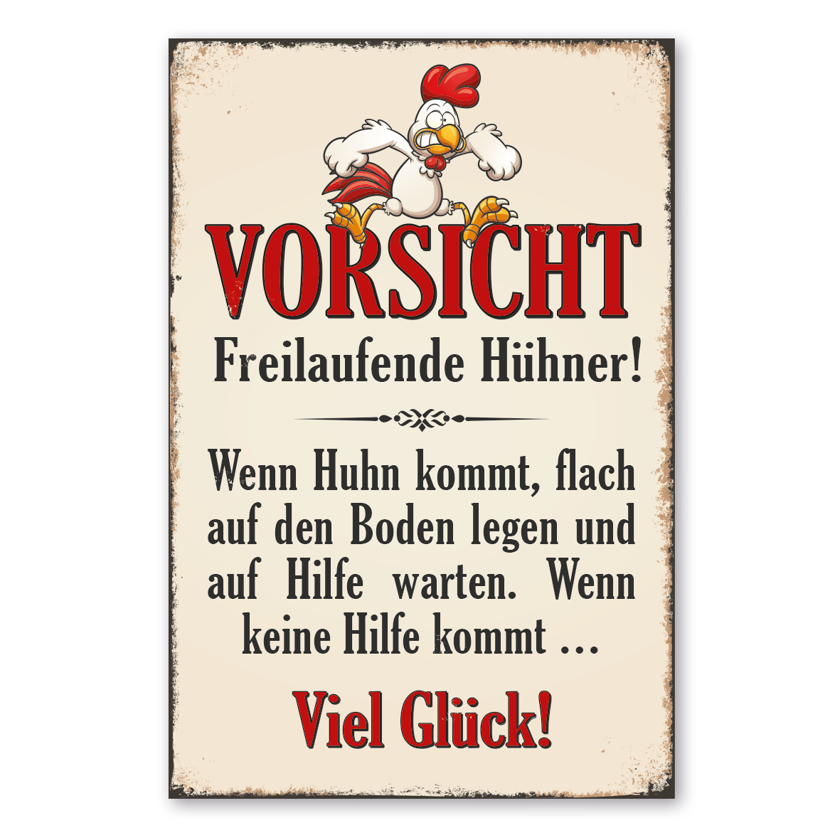 Ein Hühnerschild im angesagten Retro Look. Die Patina (Kratzer und Beschädigungen) ist nicht echt, sondern nur aufgedruckt, dennoch wirken diese Schilder alt, so als wären sie vor Jahrzehnten produziert worden. Unsere hochwertigen Retro- und Vintage-Schilder werden aus 2 mm Hartaluminium gefertigt, sie sind wetterfest und in vielen Größen erhältlich. Verschenken Sie diese dekorativen Schilder als Standardartikel oder mit angepaßten Textinhalten zum Geburtstag, zur Hochzeit, oder beschenken Sie sich selbst. Den Möglichkeiten sind kaum Grenzen gesetzt.
