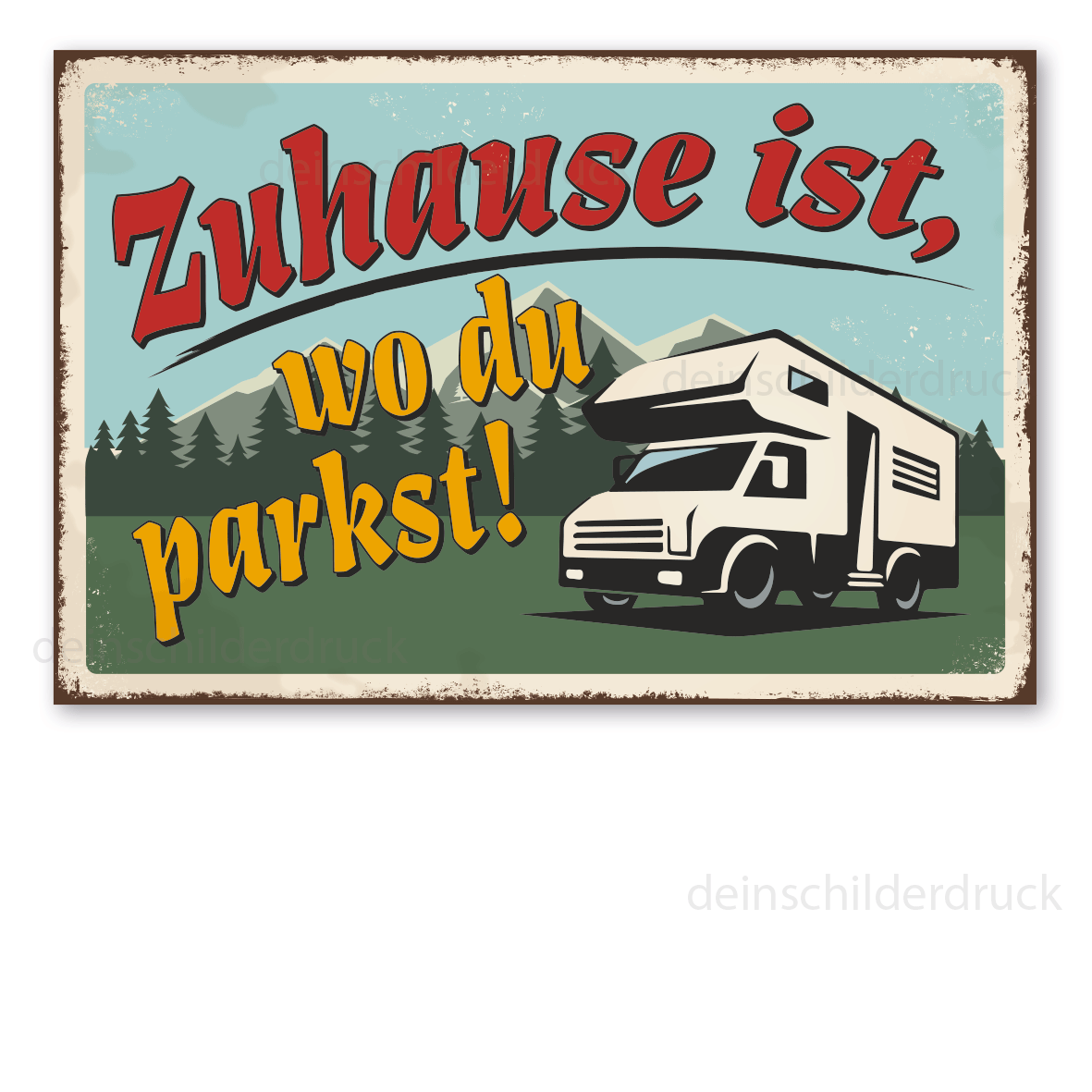 Merkmale des Retro Schildes / Vintage-Schildes Zuhause ist, wo du parkst - mit Landschaft (Wohnmobil) - VIN-1105: