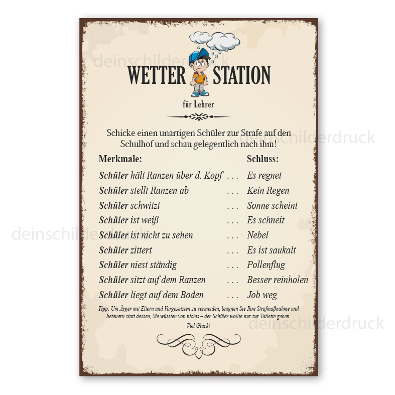Schild Wetterstation für Lehrer - Wettervorhersage mit einem unartigen Schüler - im Retro Look