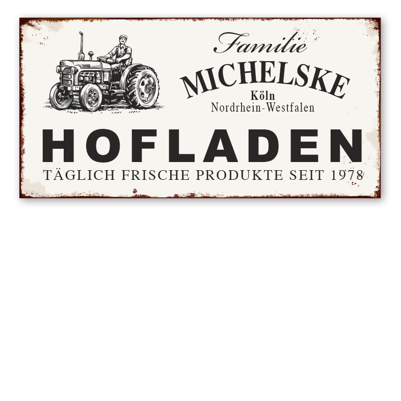 Produktinformationen "Retro Farmhouse-Schild Hofladen - Täglich frische Produkte - mit Ihrem Namen, Standort und Jahresangabe"