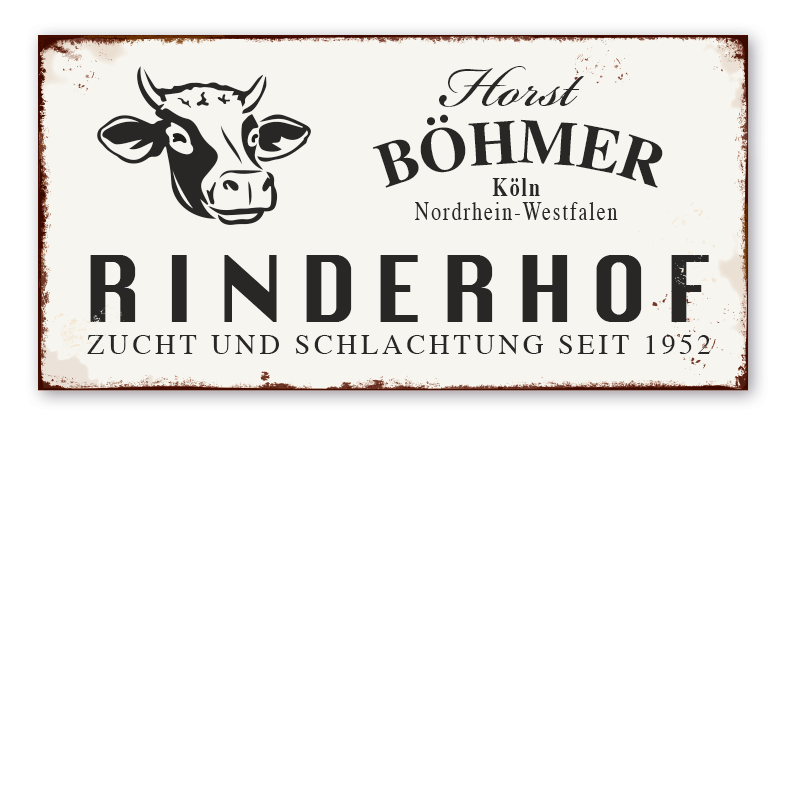 Merkmale des Retro Farmhouse-Schildes Rinderhof - Zucht und Schlachtung - mit Ihrem Namen, Standort und Jahresangabe - VIN-1327:
