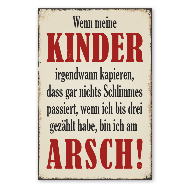 Produktinformationen "Retro Schild Wenn meine Kinder irgendwann kapieren, dass gar nichts Schlimmes passiert, wenn ich bis drei gezählt habe, bin ich am Arsch"
