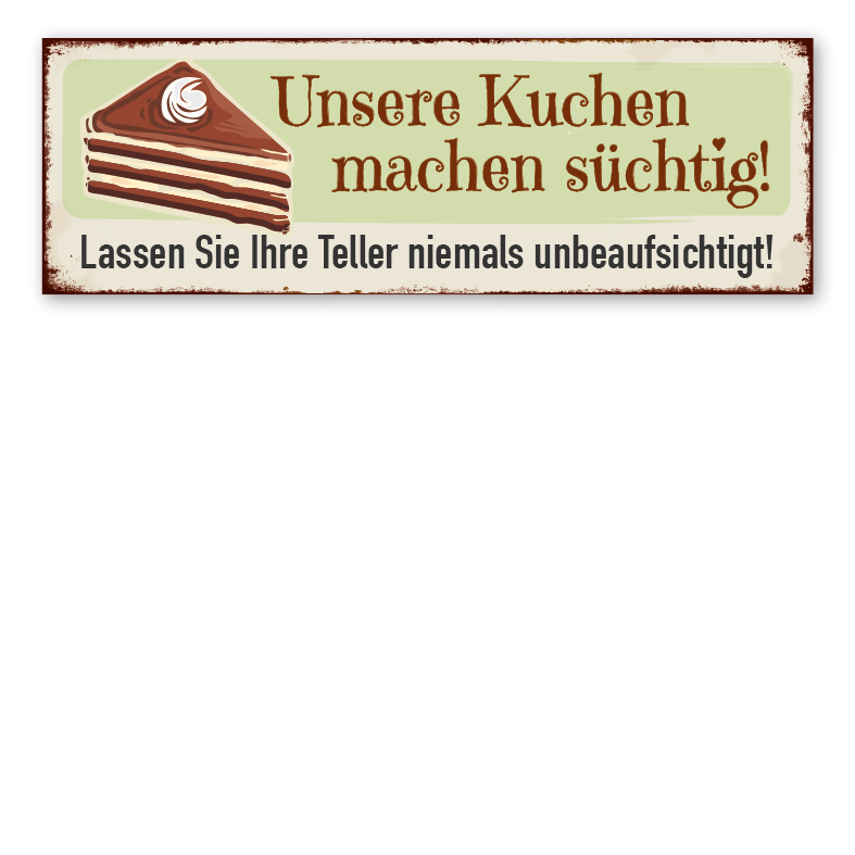 Retro Schild Unsere Kuchen machen süchtig - Lassen Sie Ihre Teller niemals unbeaufsichtigt