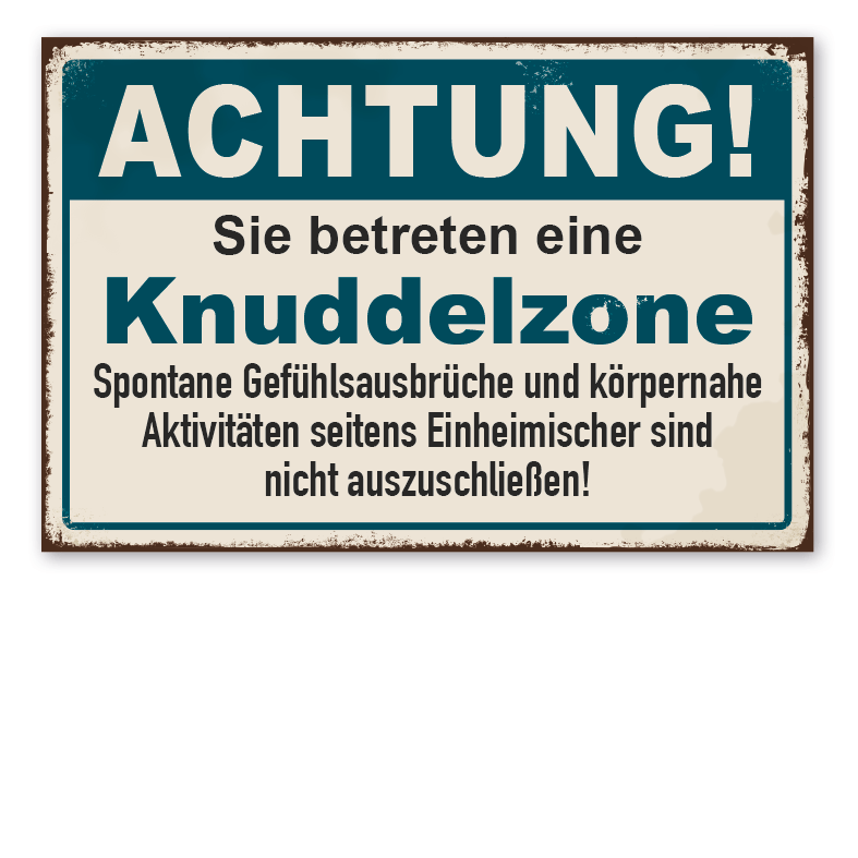 Retro Schild Achtung - Sie betreten eine Knuddelzone. Spontane Gefühlsausbrüche und körpernahe Aktivitäten seitens Einheimischer sind nicht auszuschließen