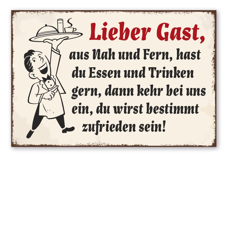Retro Schild Lieber Gast, aus Nah und Fern, hast du Essen und Trinken gern, dann kehr bei uns ein, du wirst bestimmt zufrieden sein