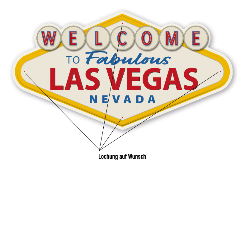 Welcome to fabulous Las Vegas Nevada ist ein berühmtes Schild im Googie-Stil, das auf dem Mittelstreifen des Las Vegas Boulevard stehend seit 1959 die Besucher der Stadt begrüßt. Unser Schild ist dem Original nachempfunden (ohne Stern und umlaufender Beleuchtung) und in diversen Größen erhältlich – auch mit Ihrem Wunschtext. Unsere hochwertigen Retro- und Vintage-Schilder werden aus 2 mm Hartaluminium gefertigt, sie sind wetterfest und in diversen Größen erhältlich.