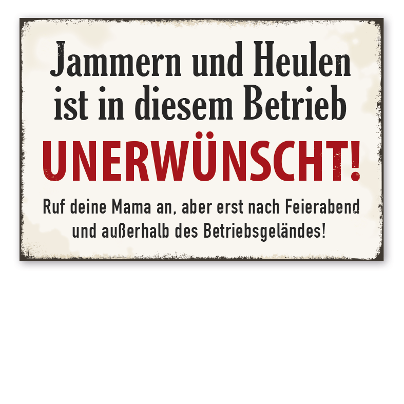 Produktinformationen "Retro Schild Jammern und Heulen ist in diesem Betrieb unerwünscht. Ruf deine Mama an, aber erst nach Feierabend und außerhalb des Betriebsgeländes"