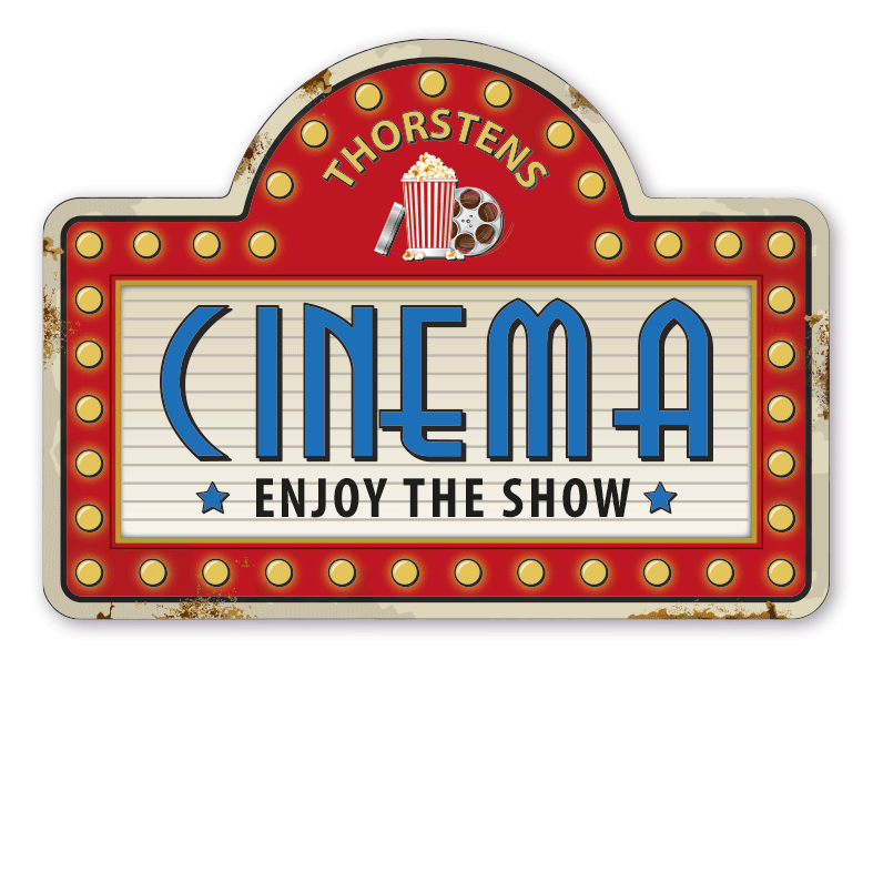 Merkmale des Retro-Schildes Theatre - Cinema - Enjoy the show – mit Ihrem Namen - VIN-2247 bzw. VIN-2248