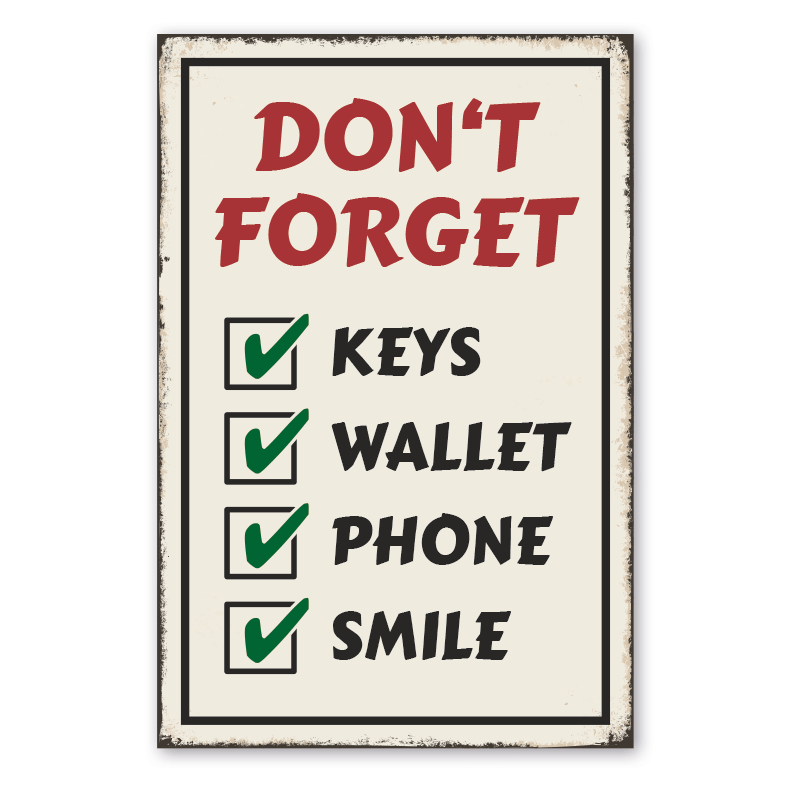 Retro Schild Don't forget - Keys - Wallet - Phone - Smile