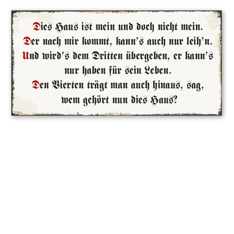 Produktinformationen "Retro Schild Dies Haus ist mein und doch nicht mein. Der nach mir kommt, kann's auch nur leih'n. Und wird's dem Dritten übergeben, er kann's nur haben für sein Leben. Den Vierten trägt man auch hinaus, sag, wem gehört nun dies Haus?"