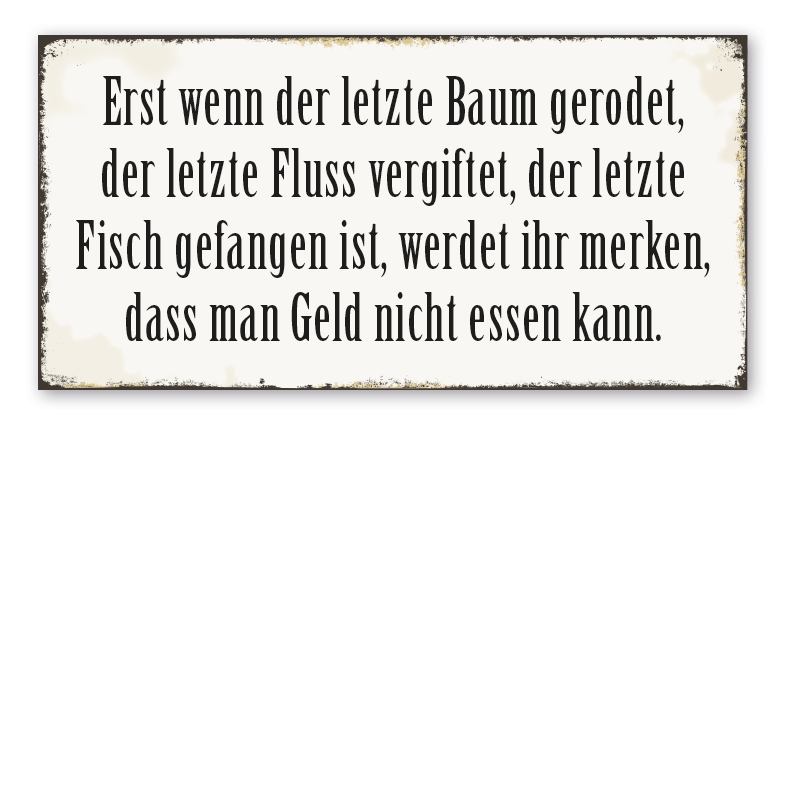 Retro Schild Erst wenn der letzte Baum gerodet, der letzte Fluss vergiftet, der letzte Fisch gefangen ist, werdet ihr merken, dass man Geld nicht essen kann