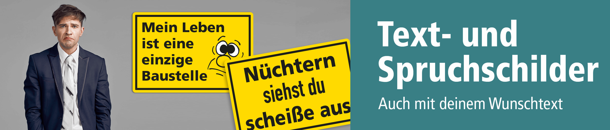 Die Fun-Kategorie Text- und Hinweisschilder beinhaltet einfache Schilder mit diversen Themeninhalten in auffälliger Erscheinung mit gelben Hintergründen und zumeist ein- oder mehrfarbigen Texten. Die Inhalte sind humorvoll, bissig, gelegentlich auch etwas derb, und gerade diese, im aktuellen Jargon gehaltenen Aussagen und "Lebensweisheiten" sind die Ursache, für die große Beliebtheit dieser Schilder und ihre Verwendung in zahlreichen Büros, Produktionsstätten, aber auch zu Hause.