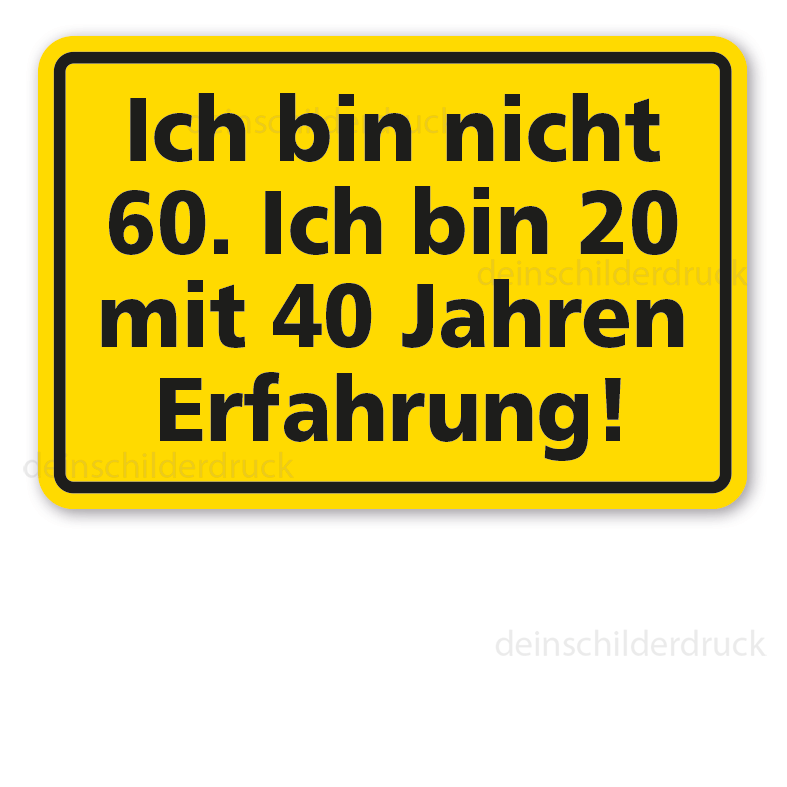 Originelles Fun-Geburtstagsschild Ich bin nicht 60 - oder mit Ihrer Altersangabe - Ich bin 20 mit 40 Jahren - oder mit Ihrer Altersangabe - Erfahrung. Fun-Schilder sind Schilder der etwas anderen Art. Sie sind humorvoll, manchmal ein wenig derb, heben sich aber von herkömmlichen Schildern deutlich ab. Fun-Schilder oder Dekoschilder können bedenkenlos auf Privatgrundstücken eingesetzt oder als originelles Geschenk weitergegeben werden. Unsere Fun-Schilder sind als Standardschilder oder in einer individualisierten Ausführung erhältlich.