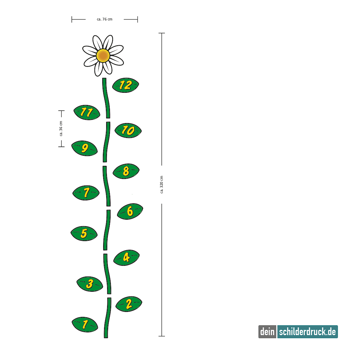 Ausreichende Bewegung trägt erheblich zu einer gesunden körperlichen und geistigen Entwicklung von Kindern bei. Leider verbringen Kinder mittlerweile viel Zeit mit Fernsehen, Online-Spielen und Spielkonsolen. Auch bestimmt der Computer schon vielfach den kindlichen Alltag – wichtige Bewegungszeit geht durch den Gebrauch dieser Medien verloren. Um diesen Defiziten entgegenzuwirken, ist es erforderlich, Kinder verstärkt zur Bewegung zu animieren – im Kreise der Familie, auf Spielplätzen, aber auch schon in Kindergärten und Grundschulen sollte auf eine Bewegungsförderung besonderer Wert gelegt werden. Bewegungspfade helfen bei dieser Aufgabe, sie regen Kinder an, sich spielerisch zu bewegen und unterstützen positiv ihre motorische Entwicklung. Unsere mehrteiligen Bewegungspfad-Sets für den Innenbereich sind in kindgerechten Ausführungen als Wand- oder Bodenkleber zur Selbstverklebung erhältlich, sie sind mit anderen Sets kombinierbar und können mit ebenfalls erhältlichen Einzelelementen einfach verlängert werden. So lassen sich auch umfangreiche, ineinander verwundene und sehr lange Bewegungspfade in großen Bereichen problemlos verwirklichen. Merkmale dieses Set-Artikels BWP-01-SET-06: Material: Hochleistungs-Vynil-Folie, Stärke 0,1 mm, transparentes, rutschfestes (DIN 51130, Klasse R9) Polycarbonat-Schutzlaminat, Stärke 0,125 mm Schwer entflammbar nach DIN EN 15501-1 Größe: Blüte: ca. 45 x 45 cm – 1 Stück Blätter: ca. 29 x 16 cm (Breite x Höhe) – 12 Stück ohne Zahlen Stängel: ca. 44 x 6 cm (Breite x Höhe) – 6 Stück Gesamtgröße: ca. 76 x 320 cm (Breite x Höhe) bei einer gradlinigen Verklebung wie auf unserem Artikelbild abgebildet Verarbeitung: formgeschnitten Verpackungseinheit: 19-teiliges Aufkleberset zur Selbstverklebung, 1 x Kaschierrakel, Informationen zur Verklebung im flachen Karton Einsatzbereiche: Innenanwendung – Flure und freie Bereiche in Kindergärten, Schulen und Freizeiteinrichtungen Bitte beachten Sie: Unsere langlebigen Bodenkleber für Bewegungspfade sind für alle glatten Böden (gegossen oder fest mit dem Untergrund verbunden) im Innenbereich geeignet. Für eine optimale Haftung ist es erforderlich, dass die Untergründe frei von jeglichen Trennmitteln sind wie Staub, Schmutz, Fett und Wachs. Bitte reinigen Sie daher vor der Montage die Böden mit geeigneten Reinigungsmitteln. Die Planung umfangreicher Bewegungspfade kann kompliziert sein, insbesondere ohne die Möglichkeit, alle Pfadmotive in ihrer Anordnung zu überblicken. Für diesen Fall stellen wir Ihnen unsere Planungs-PDF-Dateien zur Verfügung, in den unsere Bewegungspfad-Sets sowie einige Sondermotive im Maßstab 1:10 abgebildet sind. Sofern diese PDF-Daten 1:1 ausgedruckt werden und Sie einen geeigneten Untergrund (z.B. Zeichenkarton) mit dem Aufriss Ihrer Räumlichkeiten im gleichen Maßstab 1:10 angefertigt haben, können Sie die ausgedruckten Motive grob ausschneiden, auf Ihrem Untergrund beliebig hin und her schieben und für eine dauerhafte Planungsübersicht mit einem Klebestift fixieren. Diese analoge Vorgehensweise ist simpel und ermöglicht zugleich, auch mehreren Personen an der Planung mitzuwirken. Die Montage unserer Bewegungspfade ist einfach und kann auch von Ungeübten ohne Probleme sicher ausgeführt werden. Sollten Sie dennoch bei der Montage einen Bodenkleber falsch kleben oder beschädigen, bitten wir um Verständnis, dass wir keinen kostenlosen Ersatz leisten. Alle Einzelelemente eines Sets können auch als Einzelaufkleber erworben werden – zur Erweiterung Ihres Pfades oder als Ersatz bei Beschädigungen. Weitere Informationen zum Set und zur Montage können Sie im PDF-Format weiter unten unter "Verfügbare Downloads" oder über unseren Download-Bereich unter "Bewegungspfade" aufrufen. Über unseren Download-Bereich können Sie auch unsere Planungs-PDF-Dateien aufrufen.