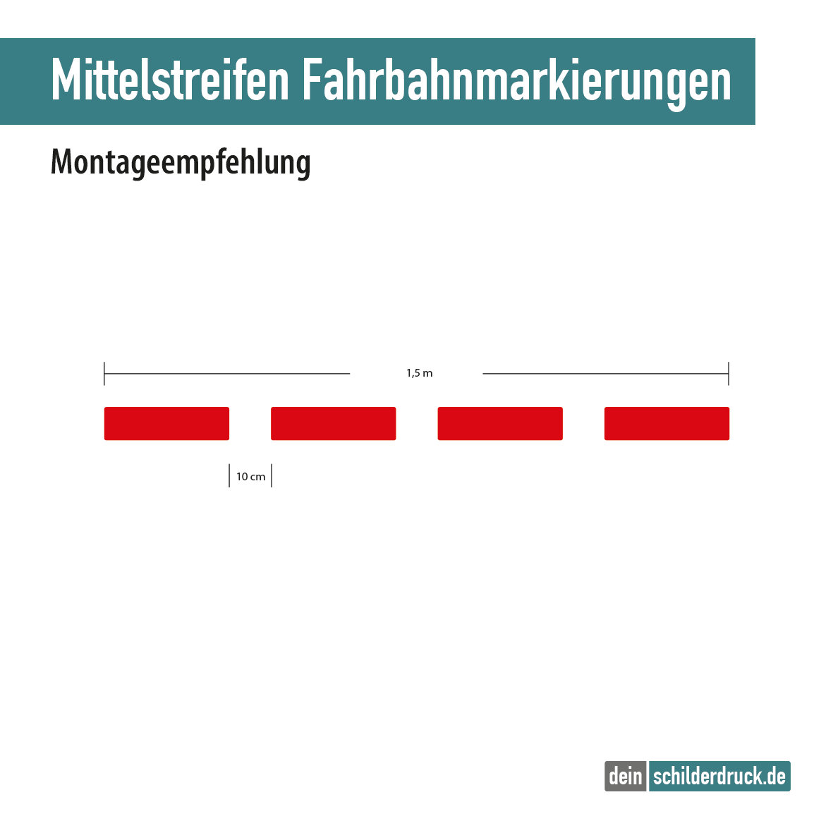 - Dieses Set zur einfachen Mittelstreifenmarkierung reicht bei einer Verklebung nach unseren Angaben für ca. 6 Meter. Die Abstände der einzelnen Segmente zueinander sollten 10 cm betragen. 4 Segmente ergeben dann genau 1,5 m (Segmentkante zur Segmentkante).
