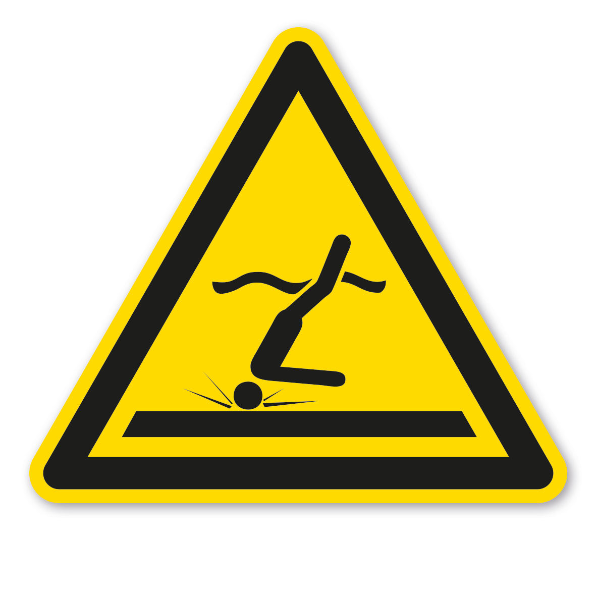 Warnung vor flachem Wasser (Kopfsprung) nach ISO 20712-1 und DIN 4844-2. Diese Warnzeichen, auch Wasserwarnzeichen genannt, sind Sicherheitszeichen die vor einer Gefahrstelle oder Gefahrensituation an Uferbereichen oder im Wasser warnen. Sie weisen darauf hin, dass eine erhöhte Aufmerksamkeit erforderlich ist, um eine Gefährdung von Personen abzuwenden. Aussage dieses Warnzeichens: Gefahr vor einem Flachwasserbereich, in dem Personen, die kopfüber ins Wasser springen, auf den Boden prallen können.