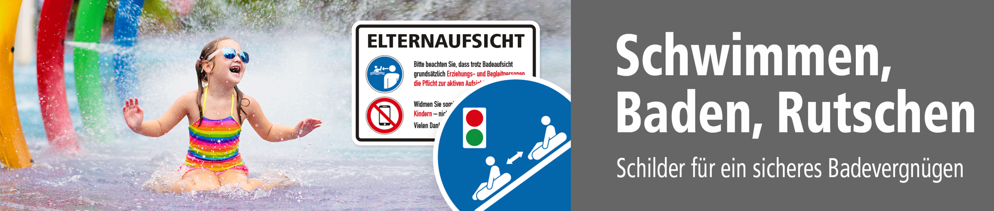 Wir führen zahlreiche Schilder für Schwimmbäder und andere Badegewässer in diversen Ausführungen und Größen – als einzelne Sicherheitszeichen oder als Kombinationsschilder, deren Texte Sie ergänzen oder gänzlich durch eigene Inhalte ersetzen lassen können. Weiterhin finden Sie in dieser Kategorie auch Schilder zur Kennzeichnung von Wasserrutschen nach DIN EN 1069-2:2017, die Sie problemlos individualisieren können. Angaben hierzu und zu allen momentan verfügbaren Piktogrammen zum Rutschbetrieb finden Sie in unserer Piktogrammübersicht Sicherheitskennzeichnung für Wasserrutschen, die Sie in Form eines PDF-Dokuments zur ersten Information aufrufen können.