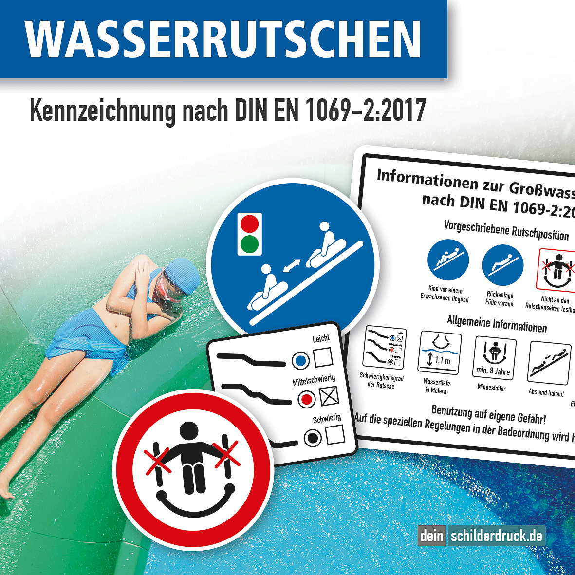 - Weitere Schilder und Piktogramme zur Sicherheitskennzeichnung von Wasserrutschen und allgemeiner Sicherheitskennzeichnung finden Sie in unserem Shop oder in unseren Zeichenübersichten (im Downloadbereich).