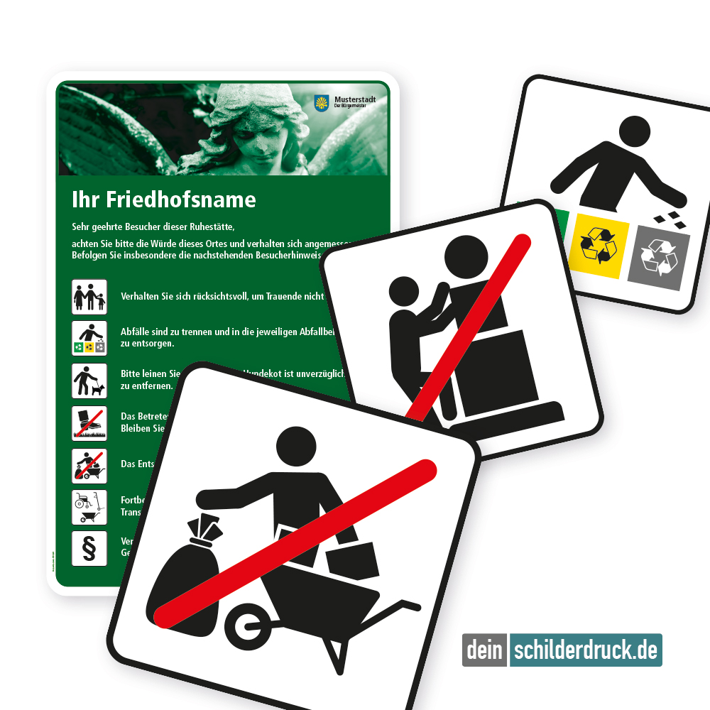 Alle öffentlichen Orte und Einrichtungen, die regelmäßig von Menschen aufgesucht werden, benötigen Hinweisschilder – so auch Friedhöfe. Wir führen zahlreiche Friedhofsschilder für die kommunale Beschilderung in verschiedenen Ausführungen, bei freier Wahl der zur Verfügung stehender Standardpiktogramme. Zudem können Sie den Friedhofsnamen eindrucken, alle anderen Textinhalte ergänzen oder gänzlich durch Ihre Wunschinhalte ersetzen lassen. Für mehr Flexibilität bieten wir dieses Friedhofsschild zudem in drei Farbvarianten an, die Sie kostenlos auf dieser Seite auswählen können. Merkmale des Friedhofsschildes mit einem Engelbild in drei Farbvarianten mit Bild und 7 Piktogrammen - 660 x 980 mm – GF-01-01: Piktogramme: maximal 7 oder weniger Material: Aluminium 2 mm Ausführung: in 3 Farbvarianten erhältlich. Abmessungen: 660 x 980 mm Verarbeitung: rechteckig beschnitten mit abgerundeten Ecken. Verpackungseinheiten: 1 Friedhofsschild Bitte beachten Sie: Dieses Kombinationsschild kann nur mit individuellen Attributen bestellt werden. Bitte wählen Sie die gewünschte Farbvariante und weitere Artikeloptionen in dem Artikelkonfigurator auf dieser Seite wie folgt aus. Im Konfigurator stehen Ihnen zahlreiche Piktogramme zur kostenlosen Auswahl zur Verfügung. Bitte beschränken Sie sich bei der Auswahl auf die maximal verfügbaren Anzahl der Piktogramme wie aus dem Artikelbild hervor geht. Wünschen Sie weniger Piktogramme als möglich, wählen Sie auch nur die benötigten Piktogramme aus. Bedenken Sie aber, dass bei weniger Piktogrammen Leerräume ( von unten aufwärts) auf Ihrem Friedhofsschild entstehen, sofern diese nicht mit zusätzlichen Inhalten gefült werden. Alternativ können Sie auch ein Friedhofsschild mit weniger Piktogrammen wählen, jedoch nicht mit einem Titelbild wie bei diesem Artikel. Eine Übersicht aller zur Verfügung stehender Piktogramme im PDF-Format können Sie über unseren Download-Bereich oder HIER aufrufen. Die Textinformationen neben den Piktogrammen auf unseren Friedhofsschildern stellen lediglich Standardinformationen bzw. die in unserer PDF-Übersicht oder auf den Friedhofsschilderdetailseiten aufgeführten Piktogrammbeschreibungen dar. Diese Beschreibungen fallen zum Teil minimalistisch aus und werden vielleicht in dieser Form Ihren Anforderungen nicht gerecht. Wir empfehlen daher, eigene, an Ihre Bedürfnisse angepassten Informationen zu den jeweiligen Piktogrammen auf Ihrem Friedhofsschild, sofern erforderlich, zu verwenden und uns diese im Rahmen der Schilderbestellung über das Texteingabefeld im Konfigurator zukommen zu lassen. Andere Texte wie Friedhofsnamen usw. lassen Sie uns bitte auf dem gleichen Wege zukommen. Wünschen Sie ein Stadt- oder Gemeindewappen bzw. ein Firmenlogo auf Ihrem Friedhofsschild, übermitteln Sie es uns über die entsprechende Option im Konfigurator. Beachten Sie bitte hierzu unsere Erläuterungen zur Datenübermittlung im Konfigurator. Schilder mit Text- und Zeichenänderungen oder nach Ihrer Vorgabe gelocht sind individuelle Schilder und somit grundsätzlich vom Rückgaberecht ausgeschlossen.
