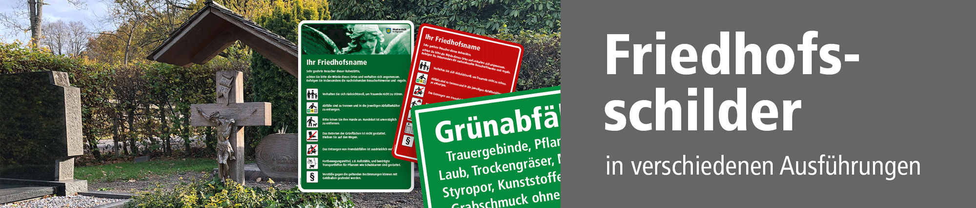 Wir führen in dieser Kategorie zahlreiche Friedhofsschilder für Städte, Kommunen und andere Betreiber in verschiedenen Ausführungen und Größen, die bei Änderungen der Titel und Inhaltsinformationen auch für Beschilderungen von Parkflächen und weiteren Grünanlagen geeignet sind. Die Platzierung der benötigten Informationen auf unseren Friedhofsschildern erfolgt in der Regel untereinander in der bewährten Kombination aus aussagekräftigen Grünflächen- und Friedhofspiktogrammen sowie dazugehörigen Bedeutungserläuterungen in Textform, die das jeweilige Gebot, Verbot oder einen Hinweis in Piktogrammform detaillierter ausführen oder um wichtige Zusatzinformationen erweitern. Wir halten für Sie zahlreiche Piktogramme mit den gängigsten Hinweisen und Aussagen zum Friedhofsbetrieb bereit, aus denen Sie im Rahmen der Bestellung kostenlos Ihre Auswahl treffen können.