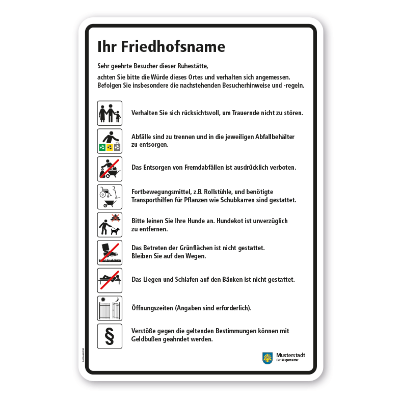 Alle öffentlichen Orte und Einrichtungen, die regelmäßig von Menschen aufgesucht werden, benötigen Hinweisschilder – so auch Friedhöfe. Wir führen zahlreiche Friedhofsschilder für die kommunale Beschilderung in verschiedenen Ausführungen, bei freier Wahl der zur Verfügung stehender Standardpiktogramme. Zudem können Sie den Friedhofsnamen eindrucken, alle anderen Textinhalte ergänzen oder gänzlich durch Ihre Wunschinhalte ersetzen lassen. Für mehr Flexibilität bieten wir dieses Friedhofsschild zudem in vier Farbvarianten an, die Sie kostenlos auf dieser Seite auswählen können. Merkmale des Friedhofsschildes in vier Farbvarianten mit 7 Piktogrammen - 660 x 850 mm – GF-01-03: Piktogramme: maximal 7 oder weniger Material: Aluminium 2 mm Ausführung: in 4 Farbvarianten erhältlich. Abmessungen: 660 x 850 mm Verarbeitung: rechteckig beschnitten mit abgerundeten Ecken. Verpackungseinheiten: 1 Friedhofsschild Bitte beachten Sie: Dieses Kombinationsschild kann nur mit individuellen Attributen bestellt werden. Bitte wählen Sie die gewünschte Farbvariante und weitere Artikeloptionen in dem Artikelkonfigurator auf dieser Seite wie folgt aus. Im Konfigurator stehen Ihnen zahlreiche Piktogramme zur kostenlosen Auswahl zur Verfügung. Bitte beschränken Sie sich bei der Auswahl auf die maximal verfügbaren Anzahl der Piktogramme wie aus dem Artikelbild hervor geht. Wünschen Sie weniger Piktogramme als möglich, wählen Sie auch nur die benötigten Piktogramme aus. Bedenken Sie aber, dass bei weniger Piktogrammen Leerräume ( von unten aufwärts) auf Ihrem Friedhofsschild entstehen, sofern diese nicht mit zusätzlichen Inhalten gefült werden. Eine Übersicht aller zur Verfügung stehender Piktogramme im PDF-Format können Sie über unseren Download-Bereich oder HIER aufrufen. Die Textinformationen neben den Piktogrammen auf unseren Friedhofsschildern stellen lediglich Standardinformationen bzw. die in unserer PDF-Übersicht oder auf den Friedhofsschilderdetailseiten aufgeführten Piktogrammbeschreibungen dar. Diese Beschreibungen fallen zum Teil minimalistisch aus und werden vielleicht in dieser Form Ihren Anforderungen nicht gerecht. Wir empfehlen daher, eigene, an Ihre Bedürfnisse angepassten Informationen zu den jeweiligen Piktogrammen auf Ihrem Friedhofsschild, sofern erforderlich, zu verwenden und uns diese im Rahmen der Schilderbestellung über das Texteingabefeld im Konfigurator zukommen zu lassen. Andere Texte wie Friedhofsnamen usw. lassen Sie uns bitte auf dem gleichen Wege zukommen. Wünschen Sie ein Stadt- oder Gemeindewappen bzw. ein Firmenlogo auf Ihrem Friedhofsschild, übermitteln Sie es uns über die entsprechende Option im Konfigurator. Beachten Sie bitte hierzu unsere Erläuterungen zur Datenübermittlung im Konfigurator. Schilder mit Text- und Zeichenänderungen oder nach Ihrer Vorgabe gelocht sind individuelle Schilder und somit grundsätzlich vom Rückgaberecht ausgeschlossen.