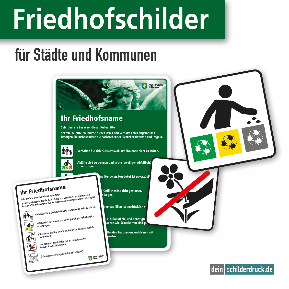 - Die Textinformationen neben den Piktogrammen auf unseren Friedhofsschildern stellen lediglich Standardinformationen bzw. die in unserer PDF-Übersicht oder auf den Friedhofsschilderdetailseiten aufgeführten Piktogrammbeschreibungen dar. Diese Beschreibungen fallen zum Teil minimalistisch aus und werden vielleicht in dieser Form Ihren Anforderungen nicht gerecht. Wir empfehlen daher, eigene, an Ihre Bedürfnisse angepassten Informationen zu den jeweiligen Piktogrammen auf Ihrem Friedhofsschild, sofern erforderlich, zu verwenden und uns diese im Rahmen der Schilderbestellung über das Texteingabefeld im Konfigurator zukommen zu lassen. Andere Texte wie Friedhofsnamen usw. lassen Sie uns bitte auf dem gleichen Wege zukommen.