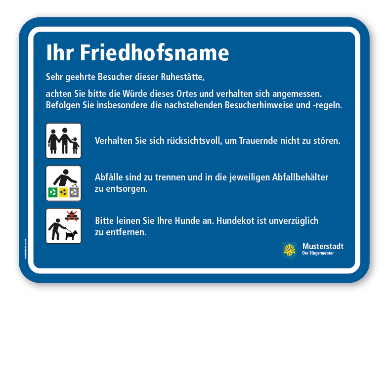 Alle öffentlichen Orte und Einrichtungen, die regelmäßig von Menschen aufgesucht werden, benötigen Hinweisschilder – so auch Friedhöfe. Wir führen zahlreiche Friedhofsschilder für die kommunale Beschilderung in verschiedenen Ausführungen, bei freier Wahl der zur Verfügung stehender Standardpiktogramme. Zudem können Sie den Friedhofsnamen eindrucken, alle anderen Textinhalte ergänzen oder gänzlich durch Ihre Wunschinhalte ersetzen lassen. Für mehr Flexibilität bieten wir dieses Friedhofsschild zudem in vier Farbvarianten an, die Sie kostenlos auf dieser Seite auswählen können. Merkmale des Friedhofsschildes in vier Farbvarianten mit 7 Piktogrammen - 660 x 850 mm – GF-01-03: Piktogramme: maximal 7 oder weniger Material: Aluminium 2 mm Ausführung: in 4 Farbvarianten erhältlich. Abmessungen: 660 x 850 mm Verarbeitung: rechteckig beschnitten mit abgerundeten Ecken. Verpackungseinheiten: 1 Friedhofsschild Bitte beachten Sie: Dieses Kombinationsschild kann nur mit individuellen Attributen bestellt werden. Bitte wählen Sie die gewünschte Farbvariante und weitere Artikeloptionen in dem Artikelkonfigurator auf dieser Seite wie folgt aus. Im Konfigurator stehen Ihnen zahlreiche Piktogramme zur kostenlosen Auswahl zur Verfügung. Bitte beschränken Sie sich bei der Auswahl auf die maximal verfügbaren Anzahl der Piktogramme wie aus dem Artikelbild hervor geht. Wünschen Sie weniger Piktogramme als möglich, wählen Sie auch nur die benötigten Piktogramme aus. Bedenken Sie aber, dass bei weniger Piktogrammen Leerräume ( von unten aufwärts) auf Ihrem Friedhofsschild entstehen, sofern diese nicht mit zusätzlichen Inhalten gefült werden. Eine Übersicht aller zur Verfügung stehender Piktogramme im PDF-Format können Sie über unseren Download-Bereich oder HIER aufrufen. Die Textinformationen neben den Piktogrammen auf unseren Friedhofsschildern stellen lediglich Standardinformationen bzw. die in unserer PDF-Übersicht oder auf den Friedhofsschilderdetailseiten aufgeführten Piktogrammbeschreibungen dar. Diese Beschreibungen fallen zum Teil minimalistisch aus und werden vielleicht in dieser Form Ihren Anforderungen nicht gerecht. Wir empfehlen daher, eigene, an Ihre Bedürfnisse angepassten Informationen zu den jeweiligen Piktogrammen auf Ihrem Friedhofsschild, sofern erforderlich, zu verwenden und uns diese im Rahmen der Schilderbestellung über das Texteingabefeld im Konfigurator zukommen zu lassen. Andere Texte wie Friedhofsnamen usw. lassen Sie uns bitte auf dem gleichen Wege zukommen. Wünschen Sie ein Stadt- oder Gemeindewappen bzw. ein Firmenlogo auf Ihrem Friedhofsschild, übermitteln Sie es uns über die entsprechende Option im Konfigurator. Beachten Sie bitte hierzu unsere Erläuterungen zur Datenübermittlung im Konfigurator. Schilder mit Text- und Zeichenänderungen oder nach Ihrer Vorgabe gelocht sind individuelle Schilder und somit grundsätzlich vom Rückgaberecht ausgeschlossen.