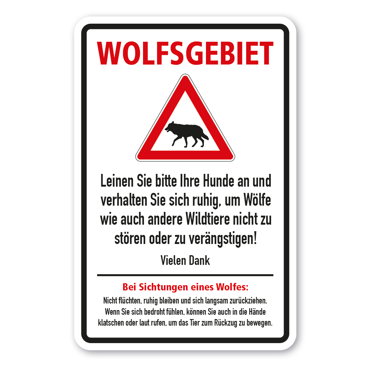 Warnschild / Tierschutzschild Warnschild Achtung, Wolfsgebiet! Mit Informationen zu Wölfen und zum Verhalten bei Begegnungen als Textschild. Textschilder sind in zahlreichen Größen und Ausführungen erhältlich, sehr gut wahrnehmbar und somit für jeden Einsatzzweck geeignet. Merkmale des Warnschildes / Tierschutzschildes Achtung, Wolfsgebiet! Mit Informationen zu Wölfen und zum Verhalten bei Begegnungen. - TX-A-184: Norm: - Material: Aluminium 2 mm Ausführung: Material standard weiß, Druck: Hintergrund weiß, Text schwarz / grün. Alternative Ausführungen sind möglich. Abmessungen: 200 x 300 mm 300 x 450 mm 400 x 600 mm 500 x 750 mm 600 x 900 mm Verarbeitung: rechteckig beschnitten mit abgerundeten oder spitzen Ecken je nach Druckmaterial. Verpackungseinheiten: 1 Textschild Bitte beachten Sie: Dieses Textschild kann unverändert gemäß der Artikelabbildung oder mit individuellen Attributen bestellt werden. Wünschen Sie einen individuellen Text, geben Sie diesen in das Eingabefeld auf dieser Seite ein. Nach Ihrer Bestellung setzen wir Ihre Wünsche um und übermittelt Ihnen eine Korrekturdatei zur Ansicht. Bitte prüfen Sie die Inhalte dieser Korrektur auf Fehler und erteilen uns, sofern alles in Ordnung ist, unbedingt die Druckfreigabe. Ihr Schild oder Aufkleber kann erst dann produziert werden, wenn uns Ihre Druckfreigabe vorliegt. Bitte beachten Sie, dass bei individuellen Artikeln die angegebene Lieferzeit erst nach erfolgter Druckfreigabe gilt. Schilder mit Text- und Zeichenänderungen oder nach Ihrer Vorgabe gelocht sind individuelle Schilder und somit grundsätzlich vom Rückgaberecht ausgeschlossen.