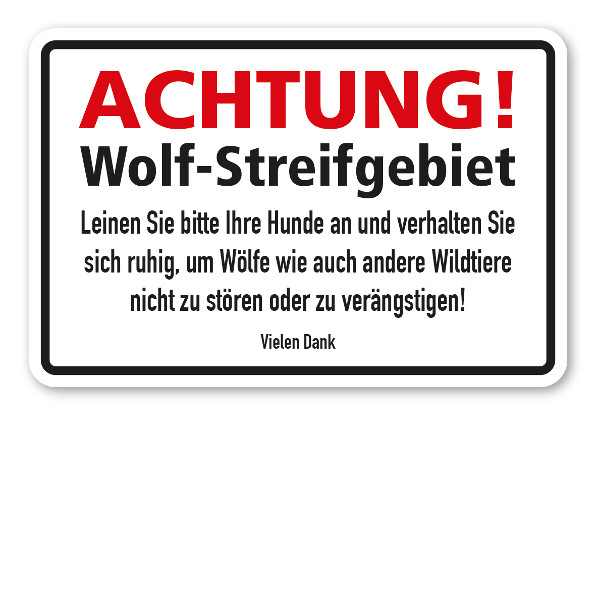 Warnschild / Tierschutzschild Hinweisschild Achtung Wolf-Streifgebiet - Mit Verhaltensregeln: Leinen Sie bitte Ihre Hunde an und verhalten Sie sich ruhig, um Wölfe wie auch andere Wildtiere nicht zu stören oder zu verängstigen als Textschild. Textschilder sind in zahlreichen Größen und Ausführungen erhältlich, sehr gut wahrnehmbar und somit für jeden Einsatzzweck geeignet.