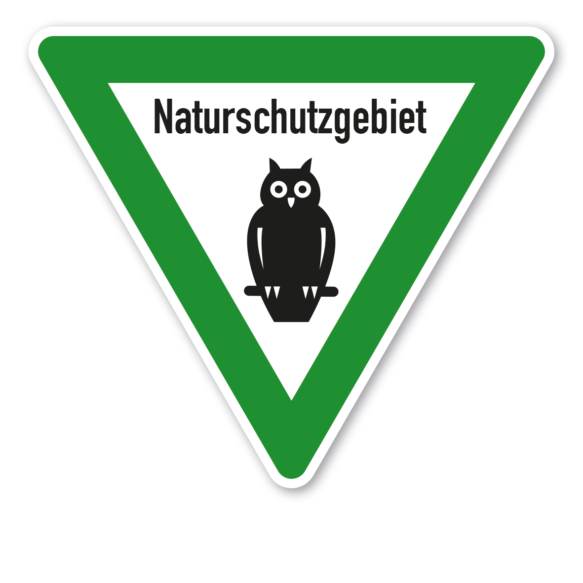 Verkehrsschild / Tier- und Naturschutzschild Naturschutzgebiet - Eule 02 mit Text. Tier- und Naturschutzschilder nach StVO und praxisbewährt stellen einen Hinweis auf eine schützenswerte Flora und Fauna dar. Besucher der ausgeschilderten Gebiete oder durchfahrende Fahrzeugführer werden mit diesen Schildern um rücksichtsvolles Verhalten gebeten, um sensible Naturbereiche nicht zu schädigen oder Tiere zu verschrecken.