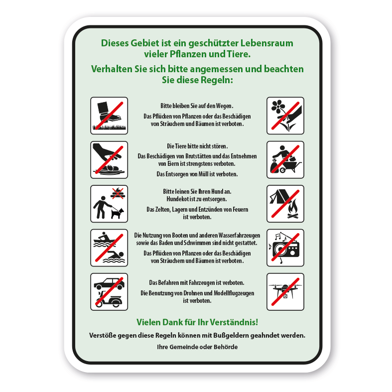 Tier- und Naturschutzschild Dieses Gebiet ist ein geschützter Lebensraum vieler Pflanzen und Tiere - mit Gebots- und Verbotspiktogrammen und Texthinweisen. Unsere Tier- und Naturschutzhinweise für Städte, Kommunen wie auch gewerbliche und private Grünflächen sind in verschiedenen Ausführungen erhältlich, bei freier Wahl der zur Verfügung stehender Standardpiktogramme. Zudem lassen sich alle Texte ergänzen oder gänzlich durch Ihre Wunschinhalte ersetzen lassen.