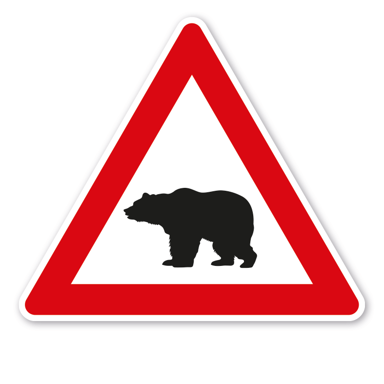 Verkehrsschild / Gefahrenschild Achtung Bären. Gefahrenschilder nach StVO und praxisbewährte Schilder stellen im Straßenverkehr eine Anordnung dar, die am Standort des Schildes oder ab diesem zu befolgen ist. Dieses Verkehrszeichen kann als Einzelschild oder in Kombination mit Zusatzzeichen, die die Symbolik näher erläutern, eingesetzt werden.
