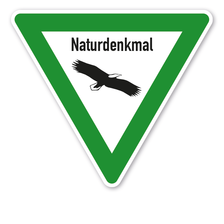 Verkehrsschild / Tier- und Naturschutzschild Naturdenkmal - Adler mit Text. Tier- und Naturschutzschilder nach StVO und praxisbewährt stellen einen Hinweis auf eine schützenswerte Flora und Fauna dar. Besucher der ausgeschilderten Gebiete oder durchfahrende Fahrzeugführer werden mit diesen Schildern um rücksichtsvolles Verhalten gebeten, um sensible Naturbereiche nicht zu schädigen oder Tiere zu verschrecken.