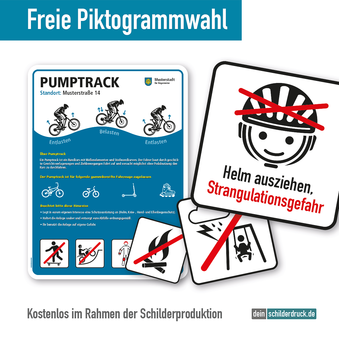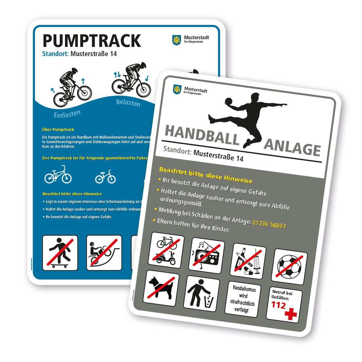• Bitte beachten Sie, dass konfigurierte Spielplatzschilder und Sportplatzschilder individuelle Artikel sind. Ein Rückgaberecht ist ausdrücklich ausgeschlossen.