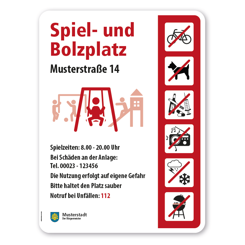 - Bitte beachten Sie, dass konfigurierte Spielplatzschilder und Sportplatzschilder individuelle Artikel sind. Ein Rückgaberecht ist ausdrücklich ausgeschlossen.
