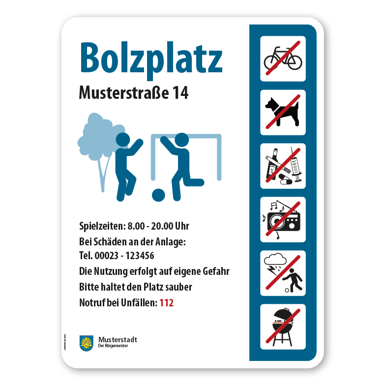 - Bitte beachten Sie, dass konfigurierte Spielplatzschilder und Sportplatzschilder individuelle Artikel sind. Ein Rückgaberecht ist ausdrücklich ausgeschlossen.