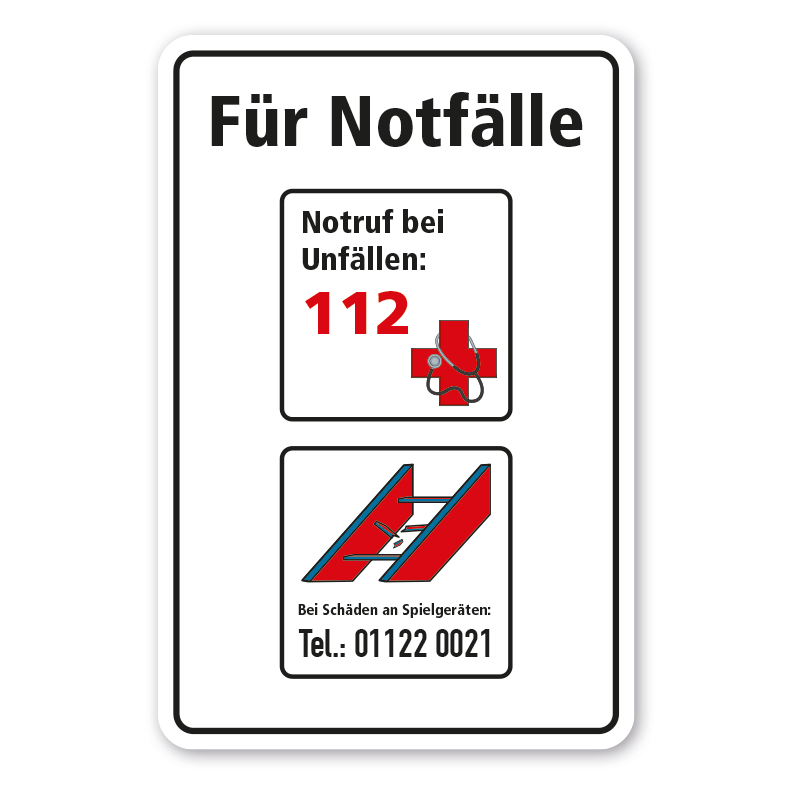 Merkmale dieses Spielplatz - Zusatzschildes Für Notfälle - Notruf 112 - Tel.-Nr. bei Schäden an Spielgeräten - Schilderserie SP-01