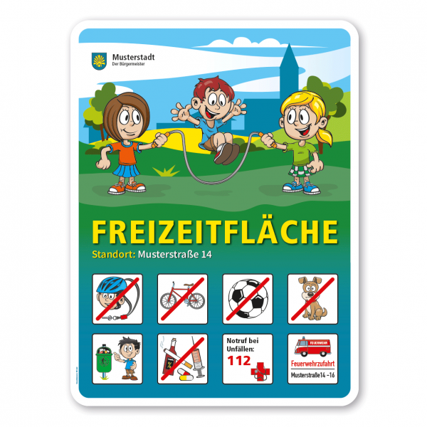 Dieses Spielplatzschild für Freizeitflächen mit spielenden Kindern und frei zu wählenden Piktogrammen ist ein Spielplatzschild aus unserer erfolgreichen Spielplatz-Schilderserie SP-01, deren zahlreiche Themenschilder mit kindgerechten, unverwechselbaren Grafiken, die auch von kleinen Kindern verstanden werden, sowie vielfältigen Individualisierungsmöglichkeiten überzeugen. So können Sie sich aus zahlreichen Piktogrammen ein auf Ihre Bedüfnisse zugeschnittenes Spielplatzschild zusammenstellen, den Schildertitel und andere Textinformationen kostenlos ändern wie auch alle Textinformationen in den Piktogrammen anpassen lassen. In Verbindung mit unseren sicherheitsrelevanten Piktogrammen und Informationen zur Spielsicherheit sowie Kontaktdaten für den Notfall entsprechen alle Spiel-, Sport- und Schulhofschilder der Schilderserie SP-01 der europäischen Norm DIN EN 1176:2008-08.