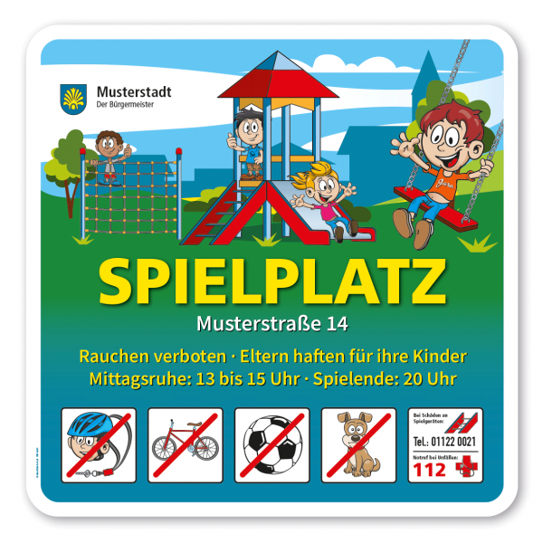 - Dieses Spielplatzschild kann nur mit individuellen Attributen bestellt werden, die über den Artikel-Konfigurator zusammengestellt werden. Es ist leider nicht möglich, auf der Artikelseite das konfigurierte Spielplatzschild darzustellen. Nach Ihrer Bestellung setzen wir Ihre Wünsche um und übermittelt Ihnen eine Korrekturdatei zur Ansicht. Bitte prüfen Sie die Inhalte dieser Korrektur auf Fehler und erteilen uns, sofern alles in Ordnung ist, unbedingt die Druckfreigabe. Ihr Spielplatzschild kann erst dann produziert werden, wenn uns Ihre Druckfreigabe vorliegt.