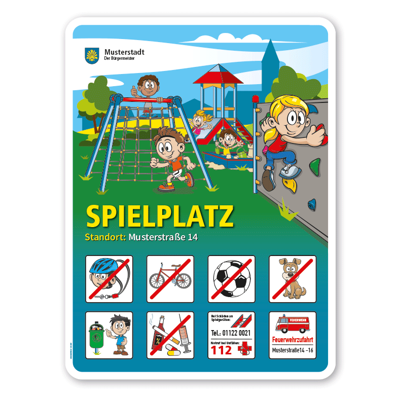 - Benötigen Sie unsere Spielplatzschilder in größeren Mengen, mit wechselnden Standortangaben und Piktogrammen in Kombination weiterer Themenschilder, z.B. für Bolzplätze, und andere Spiel- und Sportstätten, bitten wir um Ihre Anfrage. Gerne unterbreiten wir Ihnen ein Angebot mit angepassten Konditionen.