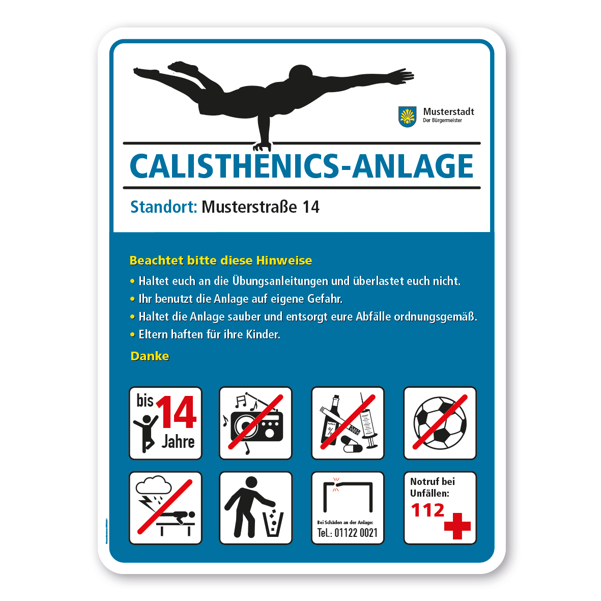 Dieses Spielplatzschild in 3 Farbvarianten mit frei zu wählenden Piktogrammen ist ein Schild aus unserer Spielplatz-Schilderserie SP-05, deren zahlreiche Themenschilder mit zeitgemäßen, unverwechselbaren Grafiken, die auch von kleinen Kindern verstanden werden, sowie vielfältigen Individualisierungsmöglichkeiten überzeugen. So können Sie sich aus zahlreichen Piktogrammen ein auf Ihre Bedüfnisse zugeschnittenes Spielplatzschild zusammenstellen, den Schildertitel und andere Textinformationen kostenlos ändern wie auch alle Textinformationen in den Piktogrammen anpassen lassen. In Verbindung mit unseren sicherheitsrelevanten Piktogrammen und Informationen zur Spielsicherheit sowie Kontaktdaten für den Notfall entsprechen alle Spiel-, Sport- und Schulhofschilder der Schilderserie SP-05 der europäischen Norm DIN EN 1176:2008-08. Merkmale des Spielplatzschildes - Calisthenics-Anlage mit 6 frei zu wählenden Piktogrammen – Schilderserie SP-05 – Art-Nr. SP-05-12: Norm: entspricht in Verbindung mit unseren sicherheitsrelevanten Piktogrammen bzw. den erforderlich Informationen der europäischen Norm DIN EN 1176:2008-08  Besonderheit: Dieses Schild ist in 3 Farbvarianten erhältlich. Wählen Sie kostenlos Ihre Variante. Anzahl der Piktogramme: 6 Piktogramme oder weniger Größe: 500 x 670 mm und 620 x 830 mm   Material: Hartaluminium 2 mm  Druck: mehrfarbig mit einer UV/Antigraffiti-Schutzlackierung  Ausführung: gemäß Ihrer Konfiguration bzw. Angaben   Verarbeitung: rechteckig beschnitten mit runden Ecken  Verpackungseinheiten: ab einem Schild  Bitte beachten Sie: Dieses Spielplatzschild kann nur mit individuellen Attributen bestellt werden, die über den Artikel-Konfigurator zusammengestellt werden. Es ist leider nicht möglich, auf der Artikelseite das konfigurierte Sportplatzschild darzustellen. Nach Ihrer Bestellung setzen wir Ihre Wünsche um und übermittelt Ihnen eine Korrekturdatei zur Ansicht. Bitte prüfen Sie die Inhalte dieser Korrektur auf Fehler und erteilen uns, sofern alles in Ordnung ist, unbedingt die Druckfreigabe. Ihr Sportplatzschild kann erst dann produziert werden, wenn uns Ihre Druckfreigabe vorliegt.   Die gewählten Piktogramme werden im Rahmen der Schilderproduktion direkt aufgedruckt, nicht als Aufkleber aufgebracht. Eine nach dem Druck aufgebrachte Lackierung schützt Ihr Schild samt Piktogrammen vor Verschmutzung und Witterungseinflüssen und erhöht die Lebensdauer.    Belegen Sie weniger Piktogrammplätze als Ihnen zur Verfügung stehen, werden Piktogramme von unten entfernt.  Benötigen Sie unsere Spielplatzschilder bzw. Sportplatzschilder in größeren Mengen, mit wechselnden Standortangaben und Piktogrammen in Kombination weiterer Themenschilder, z.B. für Spielplätze, und andere Spiel- und Sportstätten, bitten wir um Ihre Anfrage. Gerne unterbreiten wir Ihnen ein Angebot mit angepassten Konditionen.   Bitte beachten Sie, dass konfigurierte Spielplatzschilder und Sportplatzschilder individuelle Artikel sind. Ein Rückgaberecht ist ausdrücklich ausgeschlossen.  Die Piktogramme der Schilderserie SP-02, SP-02-B, SP-02-C und SP-05 sind identisch. Für beide Schilderserien gilt die Piktogramm-Gesamtübersicht SP-02. Bei den Piktogramme für die Schilderserie SP-05 wird der schwarze Rahmen entfernt.  Weitere Informationen zu unseren Piktogrammen, zu ihrer Verwendung sowie eine Übersicht aller momentan verfügbaren Piktogramme finden Sie in unserem Download-Bereich oder HIER.