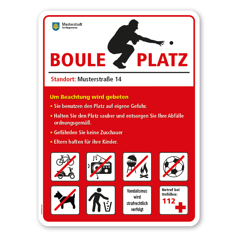 Dieses Bouleplatzschild / Pétanque-Schild in 4 Farbvarianten mit frei zu wählenden Piktogrammen ist ein Schild aus unserer Spielplatz-Schilderserie SP-02-B, deren zahlreiche Themenschilder mit zeitgemäßen, unverwechselbaren Grafiken, die auch von kleinen Kindern verstanden werden, sowie vielfältigen Individualisierungsmöglichkeiten überzeugen. So können Sie sich aus zahlreichen Piktogrammen ein auf Ihre Bedüfnisse zugeschnittenes Spielplatzschild zusammenstellen, den Schildertitel und andere Textinformationen kostenlos ändern wie auch alle Textinformationen in den Piktogrammen anpassen lassen. In Verbindung mit unseren sicherheitsrelevanten Piktogrammen und Informationen zur Spielsicherheit sowie Kontaktdaten für den Notfall entsprechen alle Spiel-, Sport- und Schulhofschilder der Schilderserie SP-02 der europäischen Norm DIN EN 1176:2008-08.
