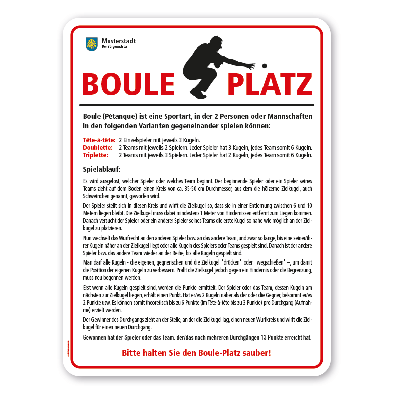 Merkmale des Spielplatzschildes / Pétanque-Schildes - Boule-Platz mit Spielregeln – Schilderserie SP-02-B: