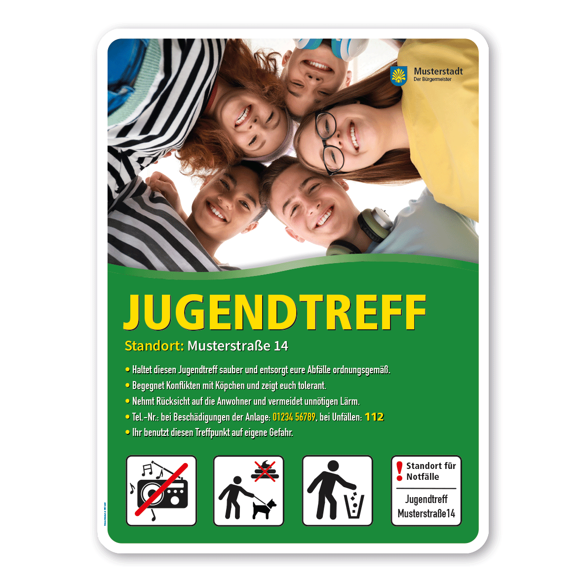 Freizeitschild - Jugendtreff mit 4 frei zu wählenden Piktogrammen – Schilderserie SP-02