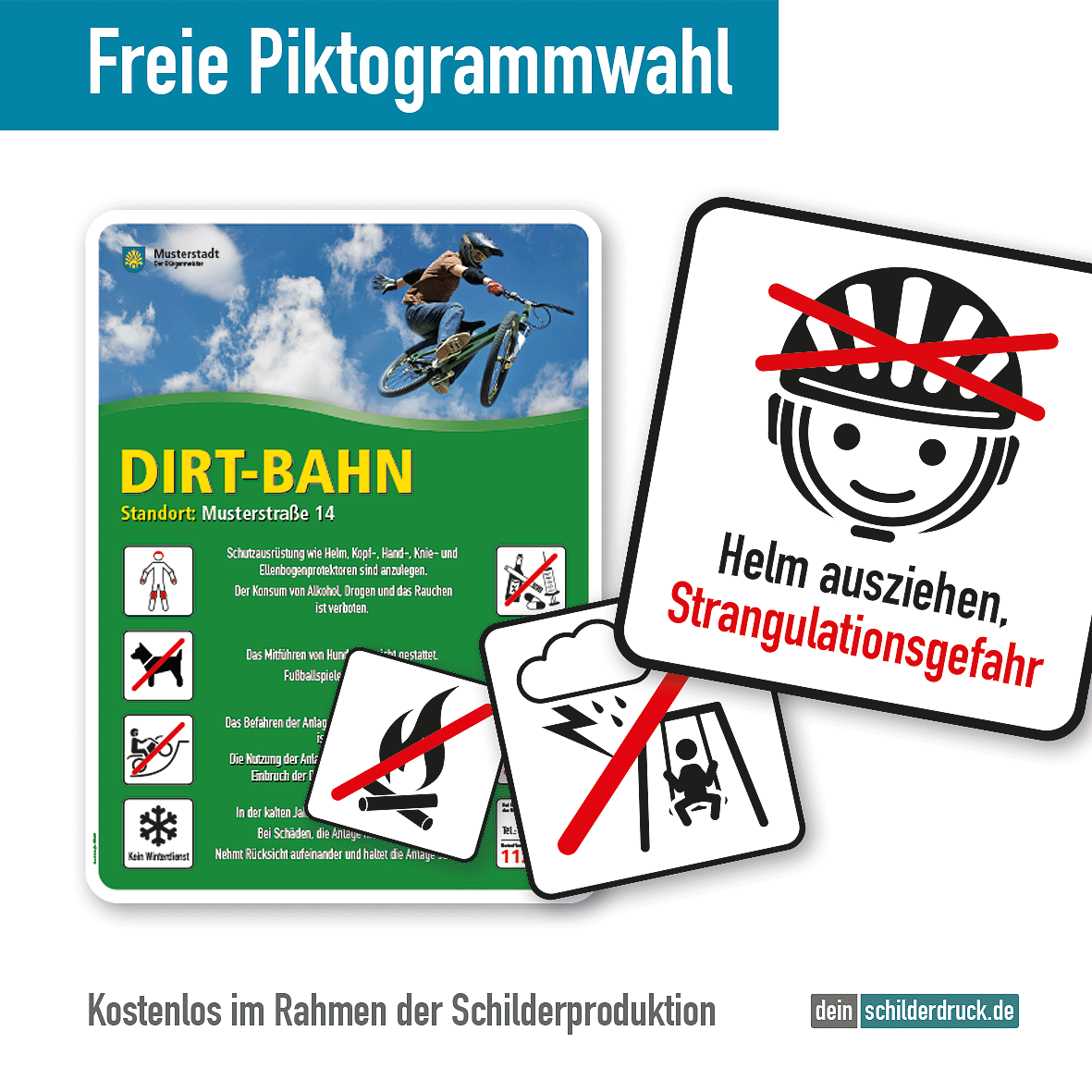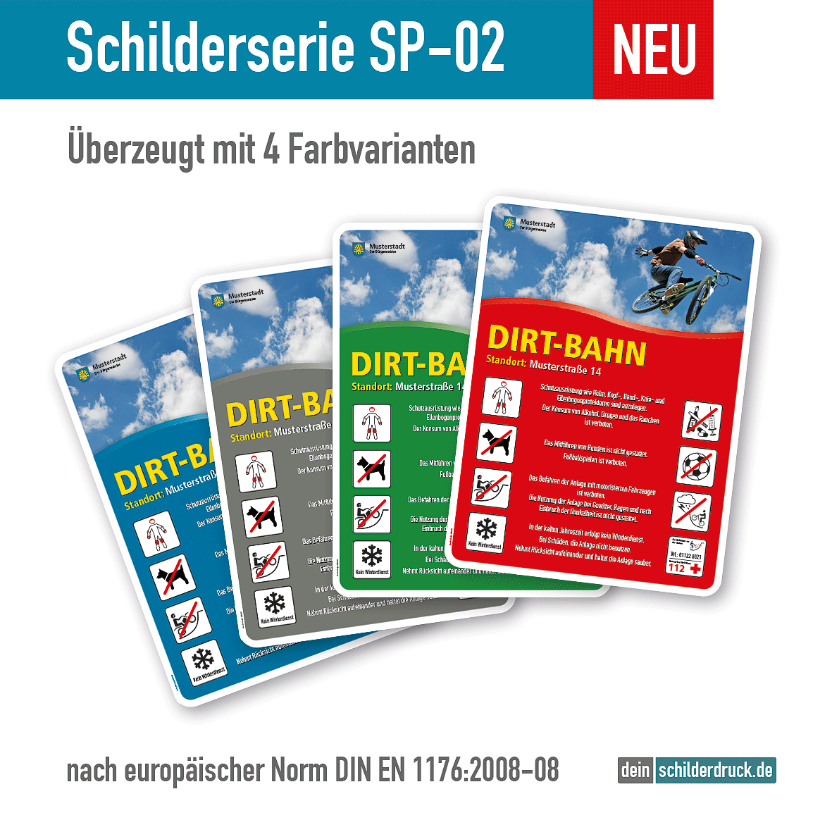 Dieses Freizeitschild in 4 Farbvarianten mit frei zu wählenden Piktogrammen ist ein Spielplatzschild aus unserer Spielplatz-Schilderserie SP-02, deren zahlreiche Themenschilder mit zeitgemäßen, unverwechselbaren Grafiken, die auch von kleinen Kindern verstanden werden, sowie vielfältigen Individualisierungsmöglichkeiten überzeugen. So können Sie sich aus zahlreichen Piktogrammen ein auf Ihre Bedüfnisse zugeschnittenes Spielplatzschild zusammenstellen, den Schildertitel und andere Textinformationen kostenlos ändern wie auch alle Textinformationen in den Piktogrammen anpassen lassen. In Verbindung mit unseren sicherheitsrelevanten Piktogrammen und Informationen zur Spielsicherheit sowie Kontaktdaten für den Notfall entsprechen alle Spiel-, Sport- und Schulhofschilder der Schilderserie SP-02 der europäischen Norm DIN EN 1176:2008-08.
