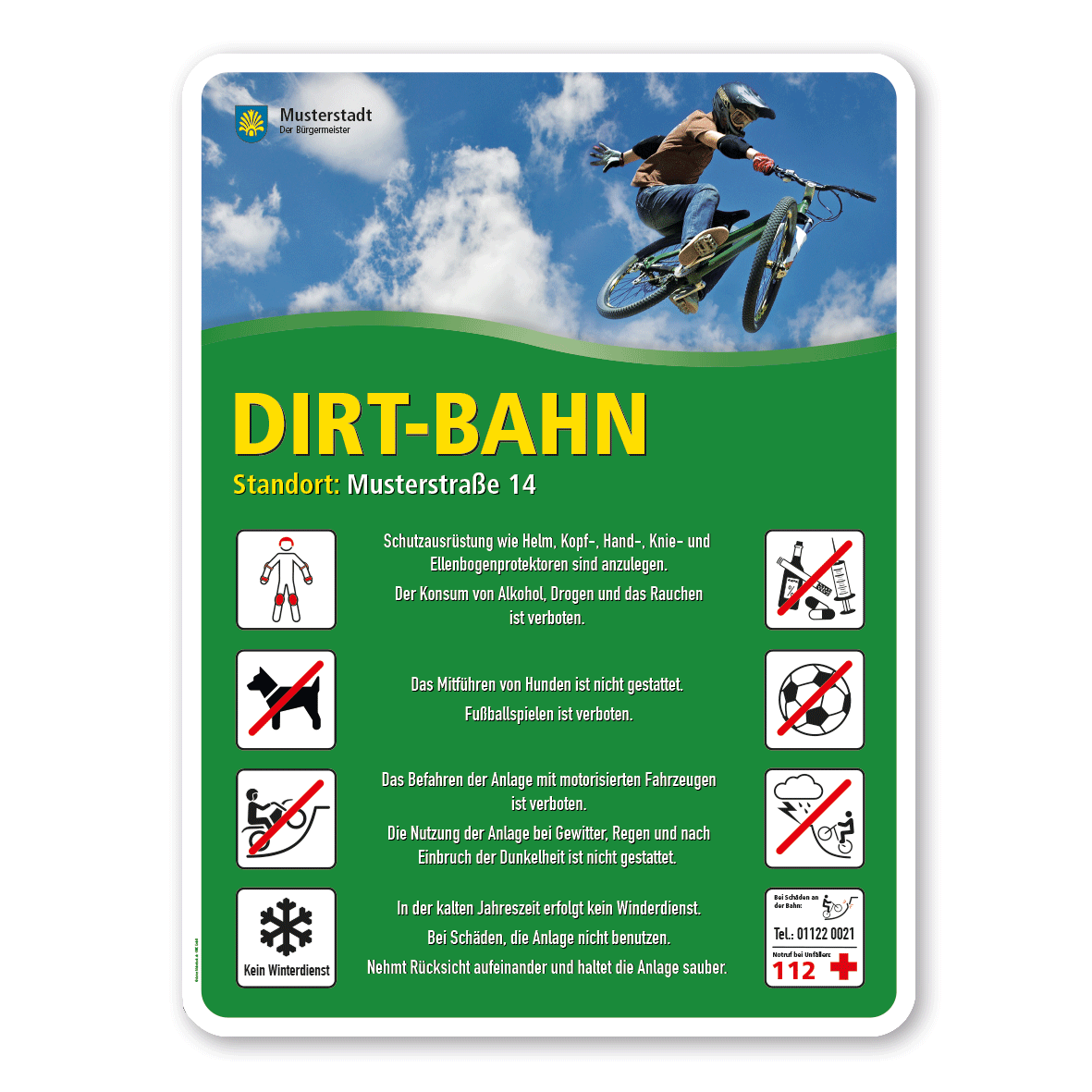 Merkmale des Spielplatzschildes - Dirt-Bahn mit 8 frei zu wählenden Piktogrammen (hoch) – Schilderserie SP-02: